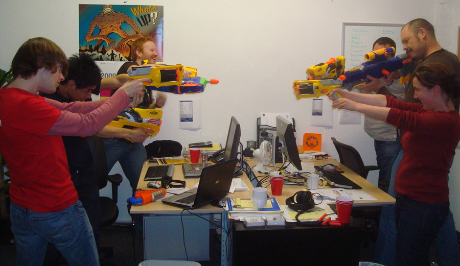 Here at JibJab, any given moment in the day can go from tranquil web programming to all out inter office warfare. We have a small arsenal of Nerf guns at our disposal, with ammunition stationed at different locations all over the office. Of course, when you’ve got this much ammo flying about on a daily basis, you pick up a few tricks to avoid the sharp sting of suction cup. Joey here has been known to dodge foam bullets. Whoa.