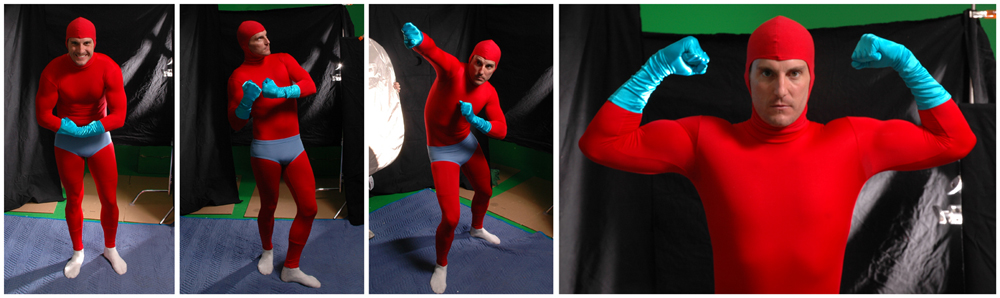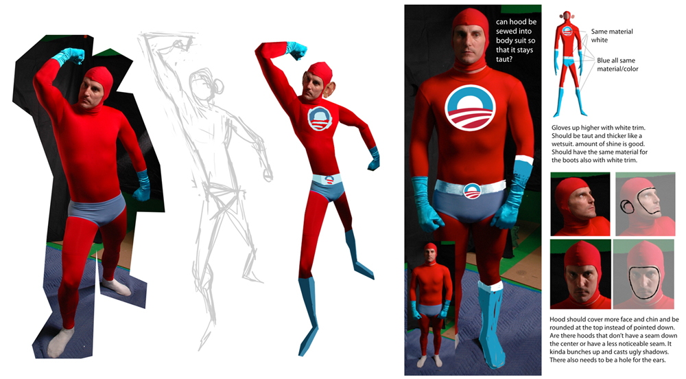 Once we had the look worked out and knew what we wanted it was time to make the costume but first we had to cast the Obama body model.  Luckily, we didn’t need to look any further than our own office!  Our Director of Community, Tim Gillons, is not only a great sport, but also one of the few people in the studio that visits a gym on a regular basis.  After he agreed to climb into the red leotard we shot some tests to make sure it’d work…