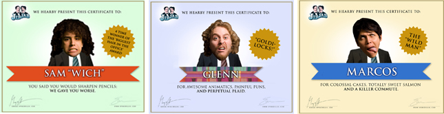 As the summer winds down, our amazing squad of summer interns are going their separate ways, back to schools that are located far too far away from JibJab for our tastes. While we get over our empty nest syndrome, we saw off our summer staffers with framed personalized certificates. Thanks for the incredible work guys! Our hope is that these hang high in your homes, reminding you to visit us often! We get lonely!
