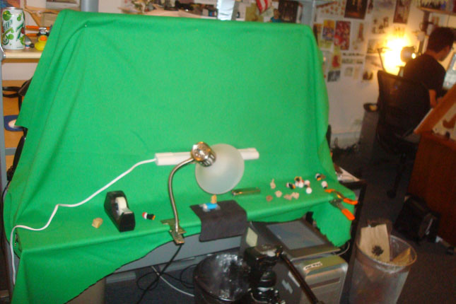We may have a huge wall in our studio dedicated to green screening items, but sometimes it’s best to have a mini studio right next to your desk, especially when you’re shooting miniature items. It may be shabby, but it gets the job done!