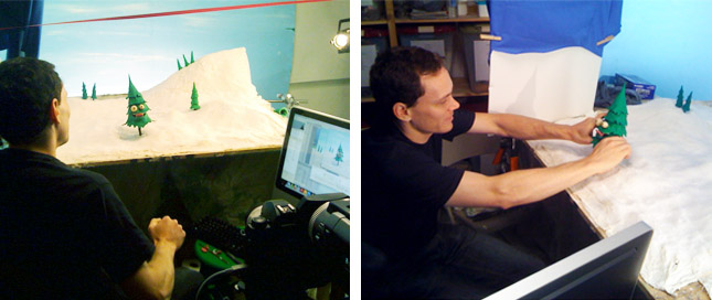 Anyone who has thoroughly perused JibJab has probably noticed our intricate stop-motion animations. There have been an array of amazing clay creatures seen on our site and this week we’ve been breathing life into this quirky little pine tree using the infamous frame by frame capture process. It’s mind meltingly tedious work, but the end result is always something to be marveled at. Here Devin, our master of claymation manipulates the tree’s trunk so that it can move and groove on our snowy set. You’ll see this one with the rest of our holiday stuff in just a few months!