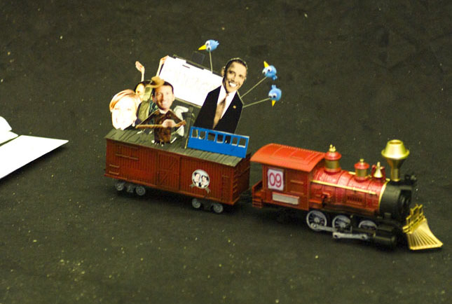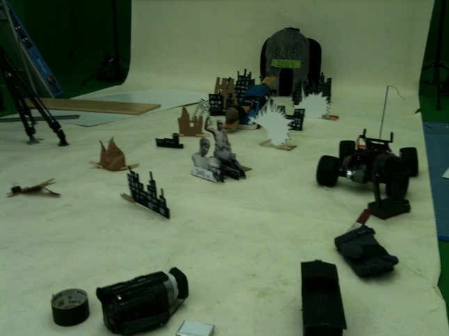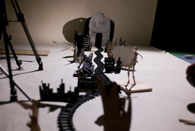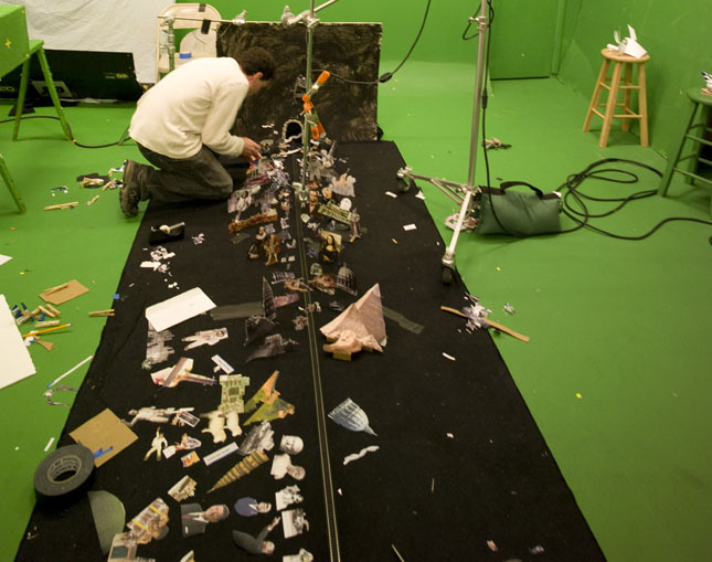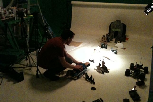 When we started on this shot we all gravitated to the idea of a calendar turning pages. How else do you show all “the years that have passed in time”? Slowly the idea morphed into a timeline – like the ones in the history books with the dots on the important dates. Finally the timeline became a train track with cars that were constantly bringing new events to the end of the line. (Maybe it’s not the clearest story idea but who can resist playing with toy trains?) For this shot, Devin and Jeff had to build physical props to represent all of human history in about 2 and a half seconds then figure out how the heck to film it!