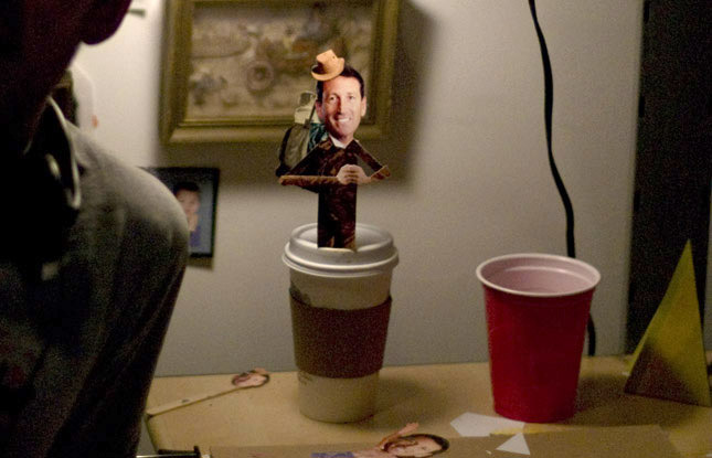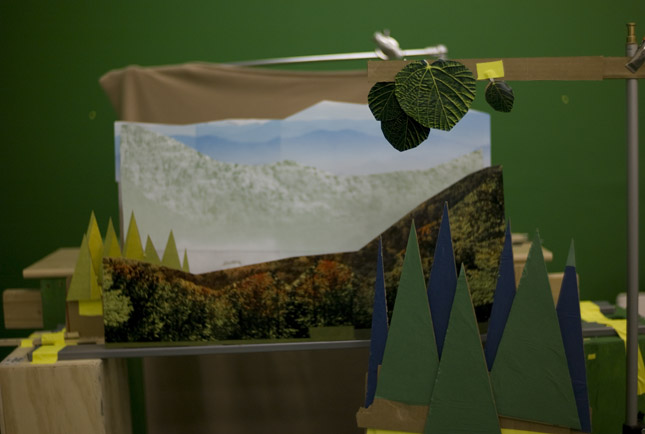 This was probably the longest scene in the whole short so we had to figure out how to keep it engaging and evolving with each new idea presented. We knew we wanted to do a lot of stuff with popsicle sticks on this project and this felt like the perfect opportunity! Below are some shots of Romney designing and building all the character and set pieces. We also knew that we wanted to have people physically remove the set to reveal the airplane and Indian Jones-esque map below so that added a lot of complication to the set up. Alan did a BEAUTIFUL job lighting and setting up the shot plus he designed and animated the map as well…