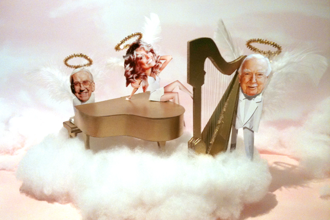 We knew from the get go that Farrah Fawcett would be perched atop the piano but originally Walter and Ed were gonna be sitting side by side tickling the ivories. Once we started building the puppets it became clear Walter should be rockin’ the harp…