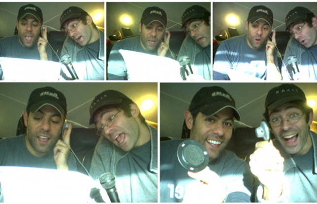 Before we get to the shot by shot breakdown of how we made the piece there are a few key steps that hold true for every project. Once we have a tune selected and a fairly solid first pass on the script we will bust out our junky microphone and sing a pass directly into Final Cut Pro. We call it a scratch track because that’s what it sounds like – chicken scratch! Unfortunately we did not have a splitter for the headphones that would enable us both to hear the music so we snapped a pair of $2 Virgin America headphones in half and had to sing REALLY close to each other. (Good thing we’re brothers!) Here’s some webcam shots of the fiasco as well as an audio pass of the first. As usual, play it softly. Unfortunately neither of us inherited our mother’s singing voice!