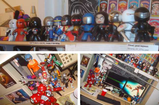 Most of the people at JibJab have fun little toys on our desks. Some display ridiculous props from our videos, while others feature favorite cartoon characters and action figures. But nobody’s collection comes even close to Dave on our design team, whose love for all things anime and geek have resulted in a collection that would make ToyFare jealous. Behold the fabled Mighty Mugs, Transformers, Macross and Voltron robots of Dave’s desk!