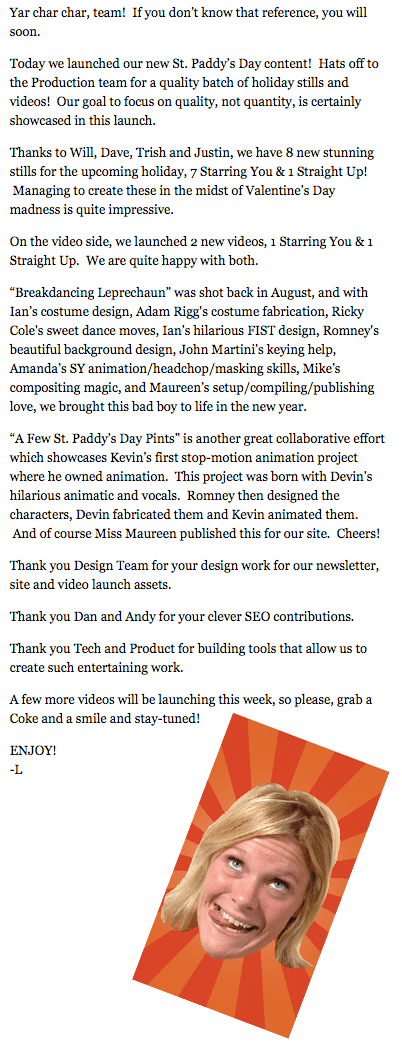 Lauren, our beyond incredible Production Director, sends out a ridiculously thorough email to the team when we launch new content. For our St. Patrick’s Day launch, things were no different. Here is a taste of what we see in our inboxes when new content becomes available.
