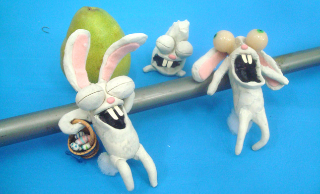 As we roll into Easter weekend, here is an up-close look at the clay bunnies we created for our stop-motion piece, with a pear for size reference. We like to stay healthy. The ears and arms were reused for the squished version of the bunny, while the eyes had to be molded to bug out when he was eventually taken away. Teeth are little painted strips of paper and the eggs are meticulously painted little specks of clay. Happy Easter everyone!