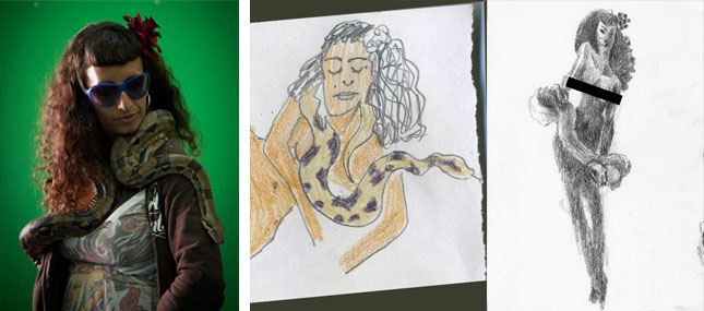 Last week we had Monica from the Venice Beach Freakshow in the studio for our artists to brush up on their life-drawing skills. The cool part? She brought her snake! This marks the first real live serpent that we’ve had within our walls. That we know of.
