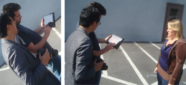 Evan loaded his iPad with one of the many Mother’s Day videos we’re working on and we hopped outside to take well lit photos of our fellow JibJabbers. Their faces will be inserted into the footage later on, as we often do, so to maintain accurate angles we cross compared the footage playing on his iPad to ensure the photos we were taking would match. It was a cinch! Footage was easier to view than watching on an iPhone and no having to bring our laptops outside, hooray!
