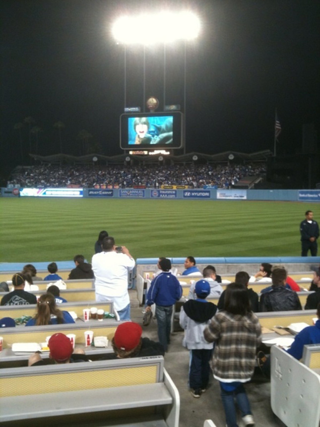 Here’s a first for us… as Andy, our Director of Development, enjoyed a Dodger game this weekend, he was surprised to find himself treated to our Star Wars Starring You on one of the biggest screens you can find! Evan writes “It looks like a giant iphone being lowered on strings from a hole in the sky by GOD.”