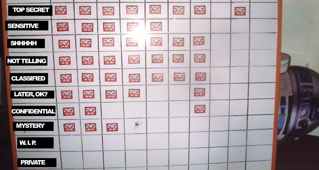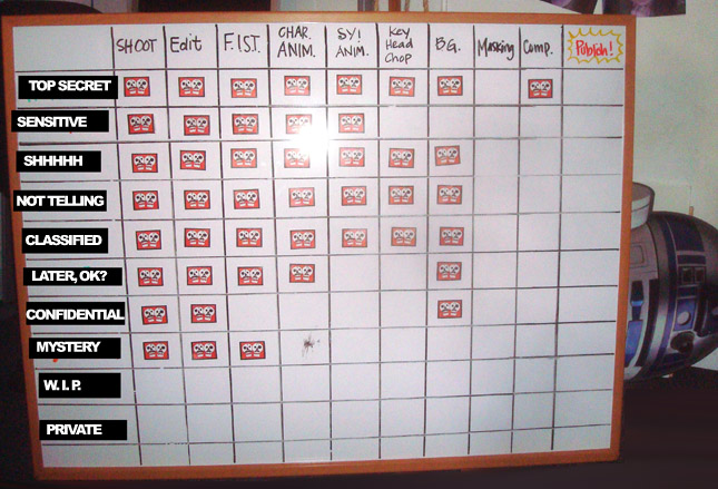 Our studio got a new addition this week in the form of an informative whiteboard that will serve as a companion to our That’s a Wrap Chart. With Starring You and animated videos, we take so many steps from project start to published art, it can be a chore just to figure out where we stand progress wise at any given point in the month. Now, as we kill each task off we can mark it as done with these little JibJab skull sticky squares that Trish designed. This big bad board is going to keep us all on the same page as we juggle a dozen projects at once.