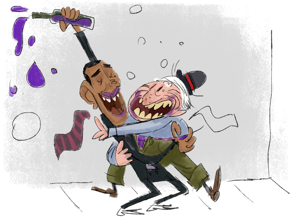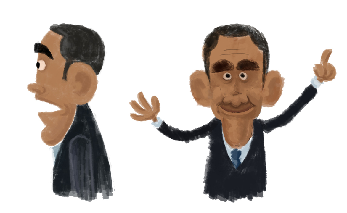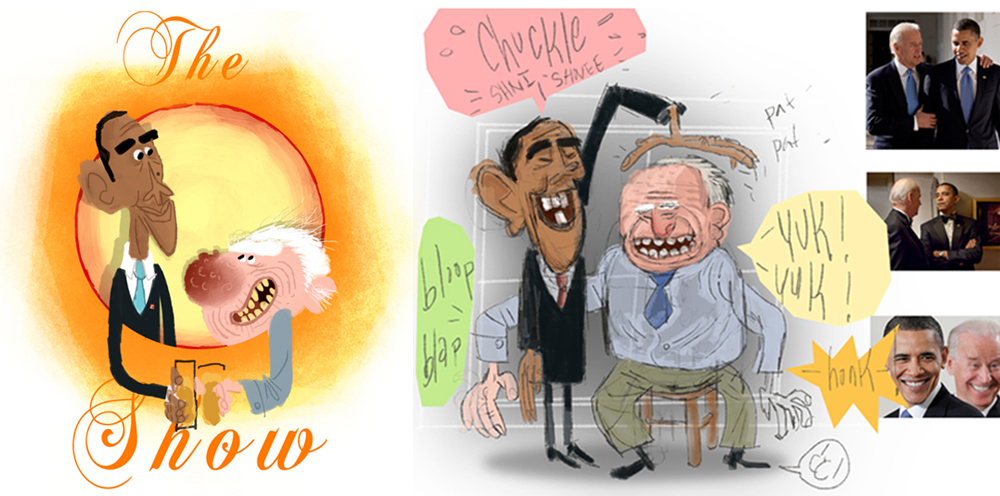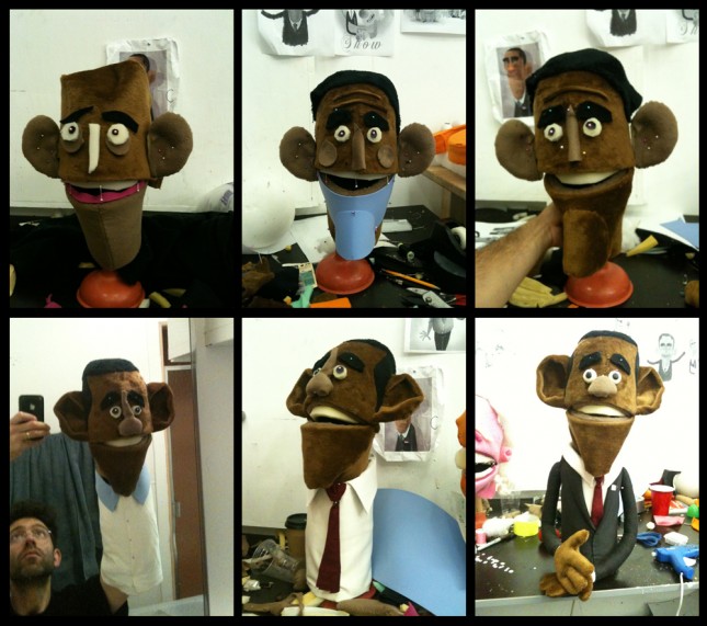 Making sure the lead characters were funny was one of the most important challenges the Art team faced. If we could make Obama and Biden funny then everything else would snap into place. In fact, the song was originally just Obama’s with an occasional throw to Biden but when Romney turned out some ‘buddy’ drawings it got everyone really excited. Here are some of the drawings that inspired the final designs for the puppets as well as working pics of the puppets themselves…