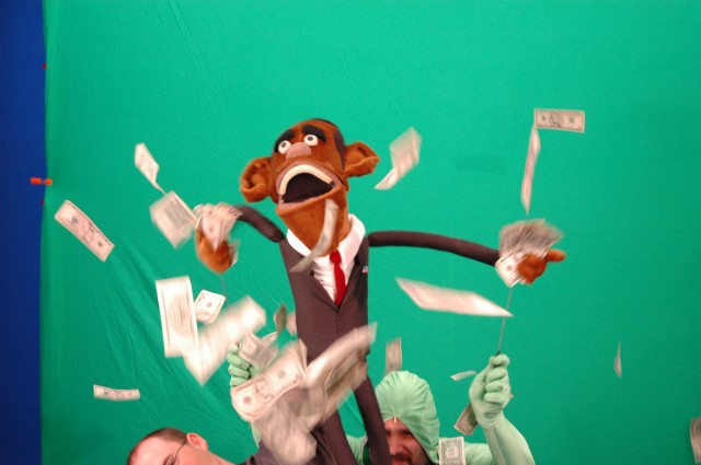We just love thrown’ money around! We collected a big old stack of ones and fives, pinned a few to Obama’s hands then the puppeteers got to have a party…