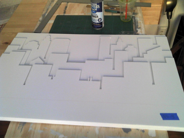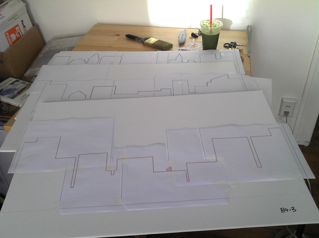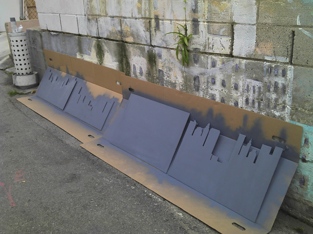 Then there were the backgrounds to contend with! Here’s a sequence of Kevin doing the layouts, carving the foam core, then spray-painting them in his back alley…