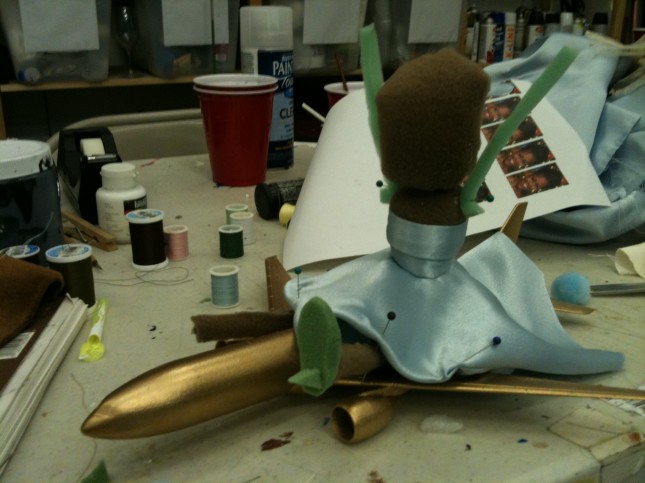 Michelle Obama caught a bunch of slack this year for using Air Force Two to take 40 of her friends on a lavish vacation she took to Spain. So how do we illustrate it? Have the first lady dressed like a princess perched atop golden airplane! We went to the toy store and bought a good sized plane. After spray painting it gold we set to work building the puppet…