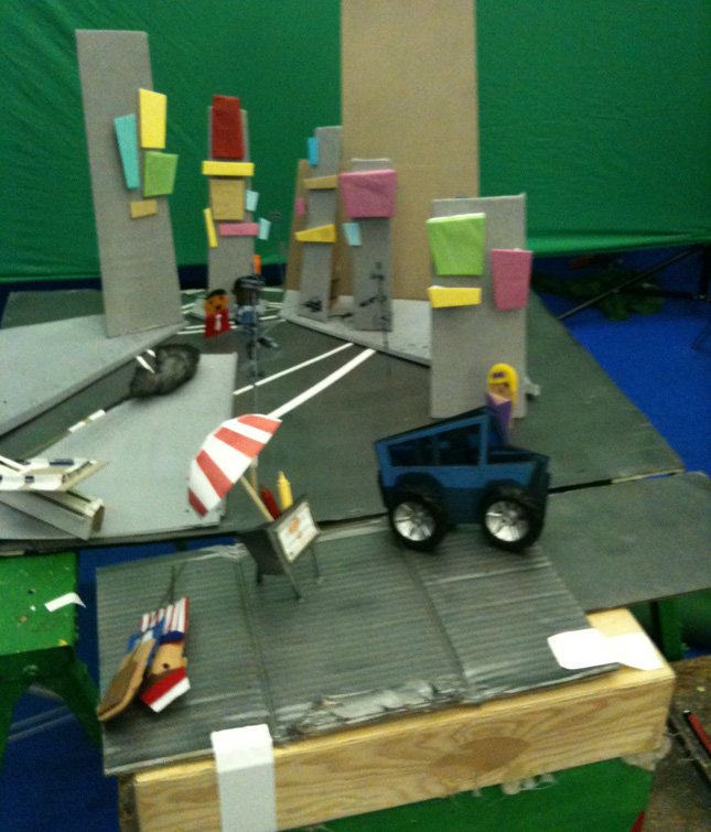 Dave built an insanely elaborate set with functioning lights, smoke on a geared stick and a pretty sweet looking hot dog stand! This set was so sweet, it’s a shame it had less than a second of screen time in the end product…