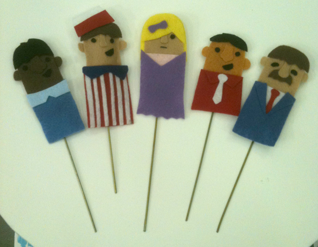 Once the puppet was built and photographed, Dave printed it onto a tiny newspaper then placed it in itty-bitty puppet hands for the shot…