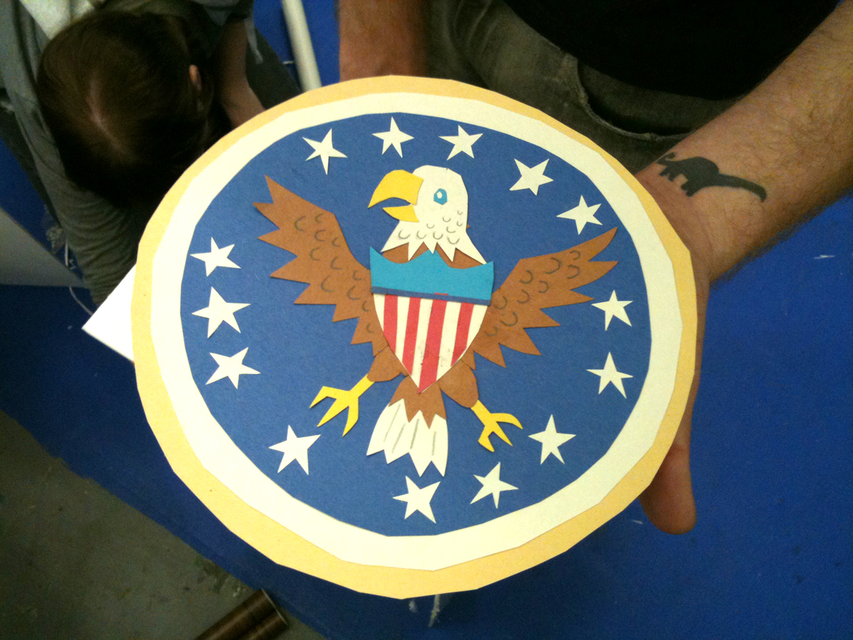 This scene might be a bit more of an obscure reference but we managed to sneak it in anyway. It happened at Fortune Magazine’s “Most Powerful Women Summit” at about 27 seconds into this video. To the President’s credit, he was pretty quick with a good humored response. For us, it was just fun to build a wonky Presidential podium out of foam core and wood paneled stickers! Here’s a shot of Justin’s ‘Presidential Seal’…