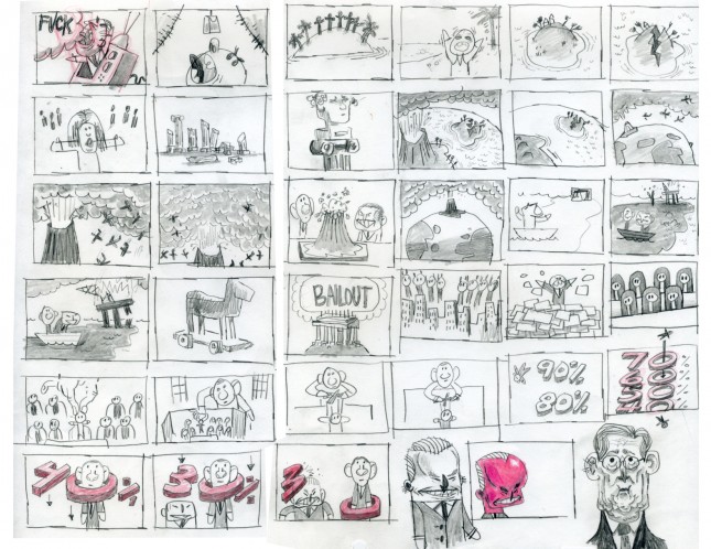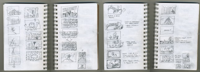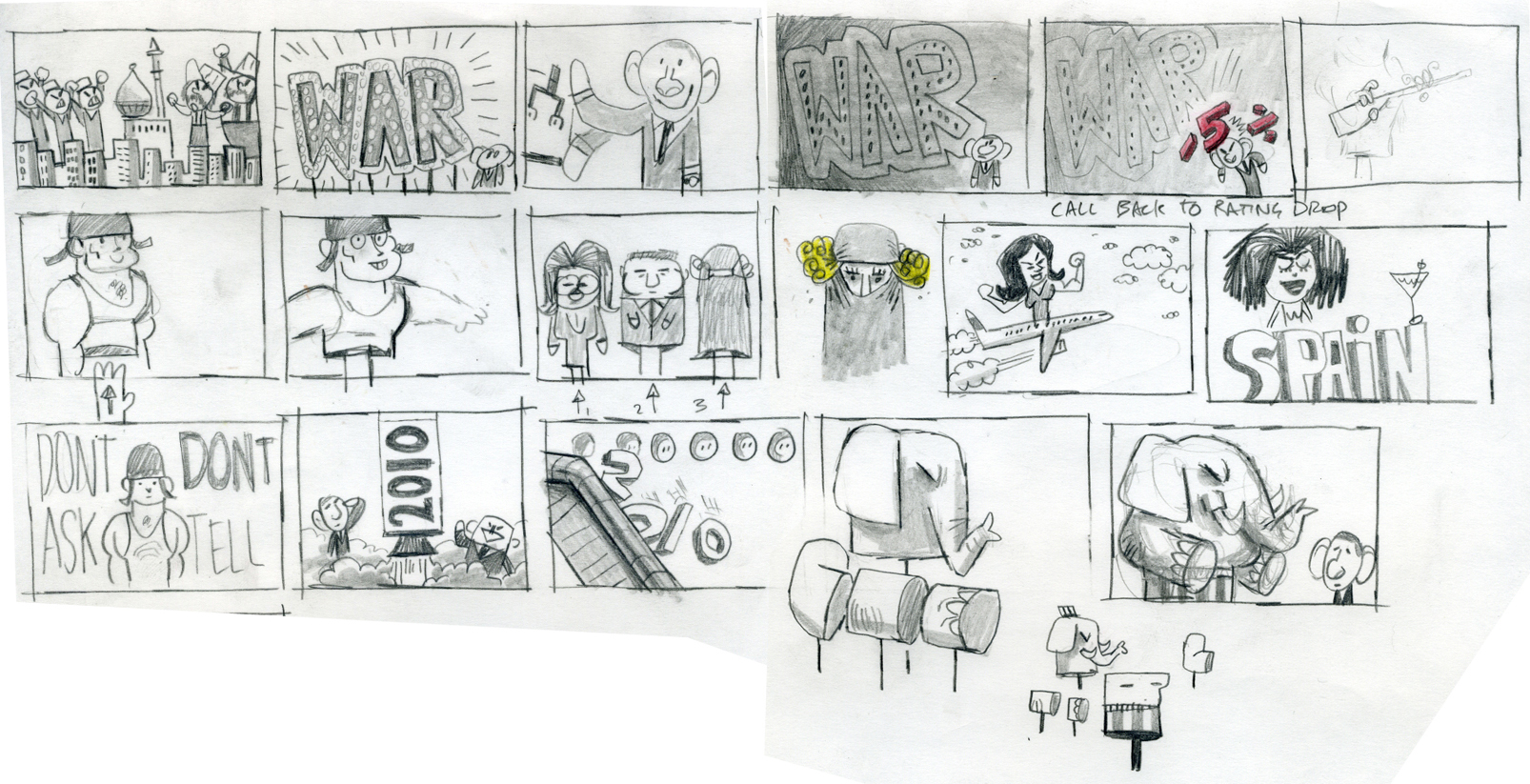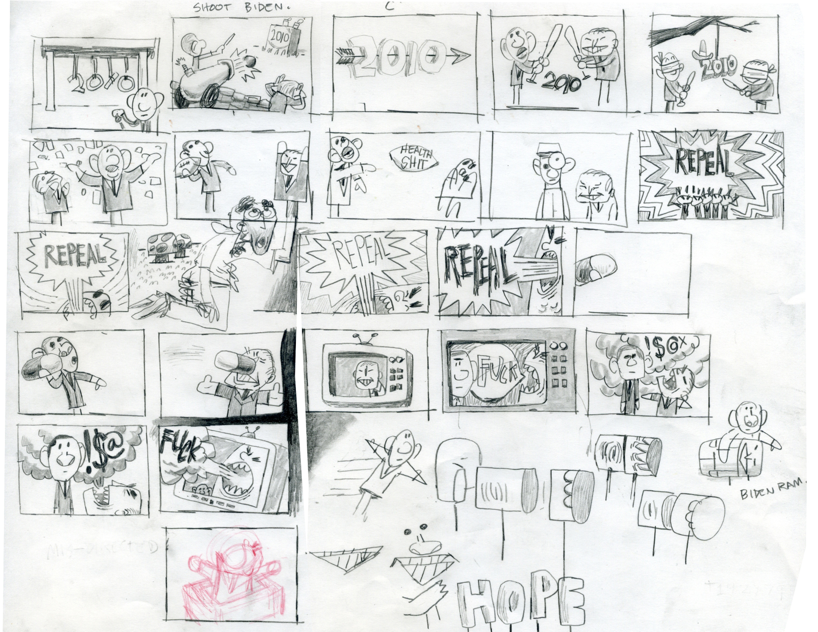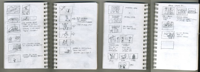 Once we are feeling pretty good about where the script stands, we’ll start doing little drawings to help visualize the ideas. We call these drawings ‘thumbnails’ because in the old days of animation that’s how big they drew them – the size of your thumbnail! These drawings are not meant to be pretty, their sole purpose is to allow the artists to explore all the possible of ways communicating an idea without investing a lot of time. Once we pick the idea we want to pursue, we flesh it out later in the process…