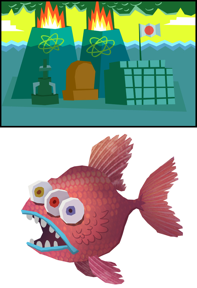 The idea when this scene was story boarded was always to build a set, put it in a fish tank and then fill it with water. Jeff had really wanted to get a real goldfish and have it swim by but that proved to be a bit complicated given our timeline. Next, we toyed with the idea of having an homage to Blinky the Three Eyed Fish from the first season of the Simpsons and we even built the puppet but ultimately that just confused the shot as well. This was another case of us trying to jam an extra gag into a 1/2 second shot!