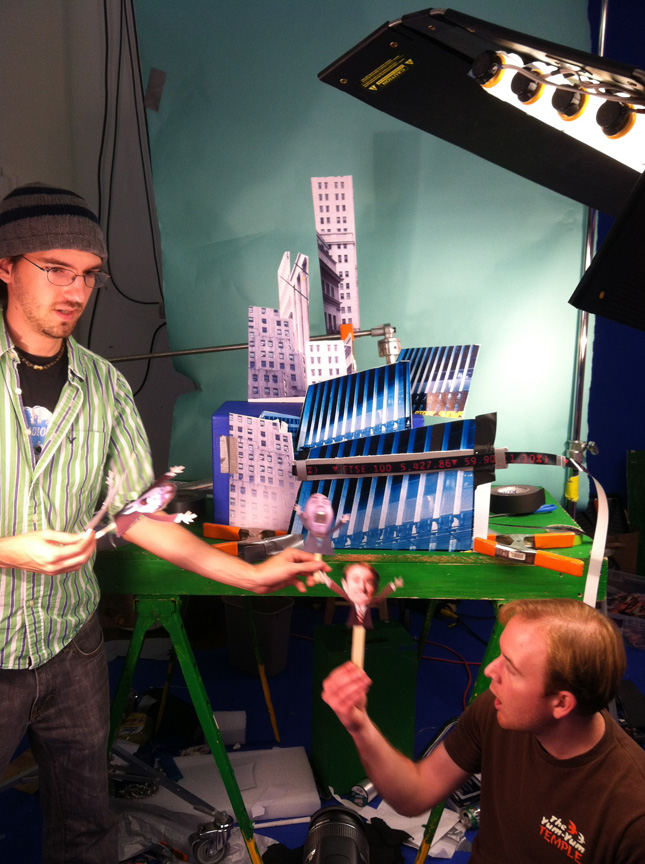 Our favorite part of this scene is ridiculous faces our teammates made while pretending to be panicked investors! We’ve got Mike, Andy, Liz, Trish and Justin scurrying about and Justin even got to operate the Justin puppet. Crazy, man…crazy.