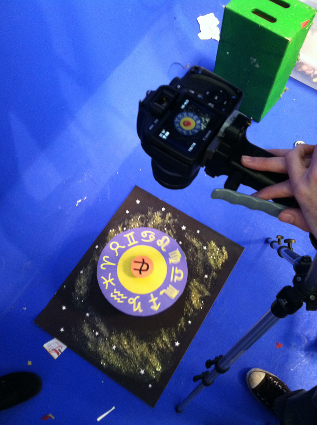 It’s hard to tell from this photo but the zodiac sign was mounted to a bowl that was sitting inside another bowl that was filled with an inch of water. Talk about an easy way to make something spin smoothly and effortlessly.