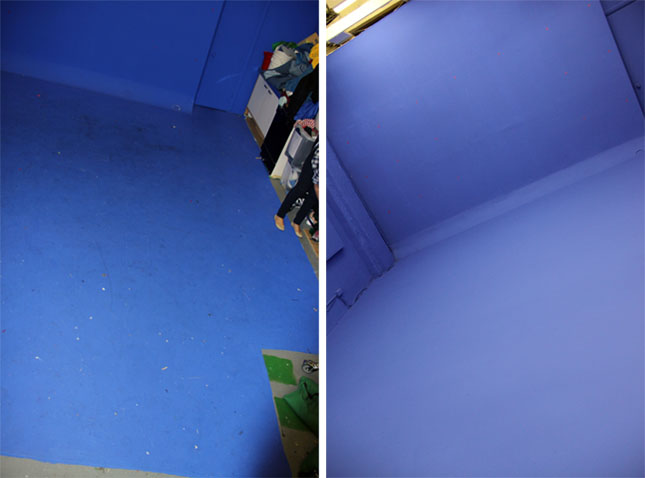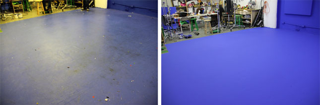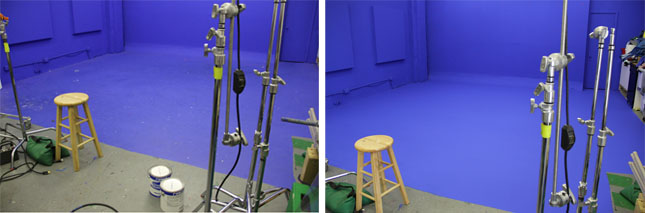 We trounce hard on our blue screen… and between dancers, paint, clay, puppeteering and confectioneries… the thing gets filthy. So once every few months we give it a fresh coat. Amia worked on this one late last night so it could be dry for shooting this morning. Hat tips to you, madame!